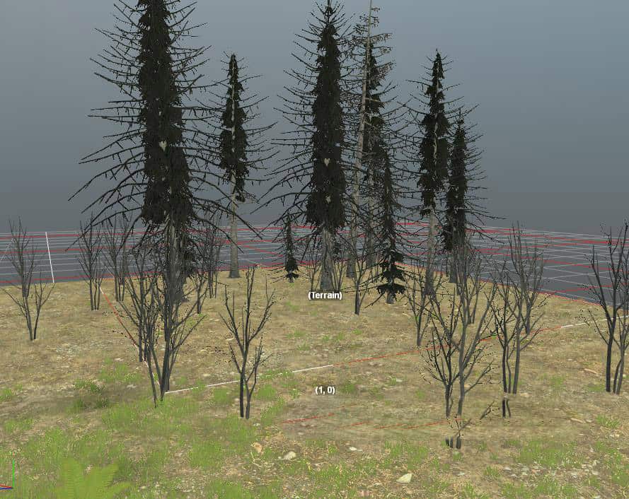 Fire – The brush includes several fir trees and a bush.