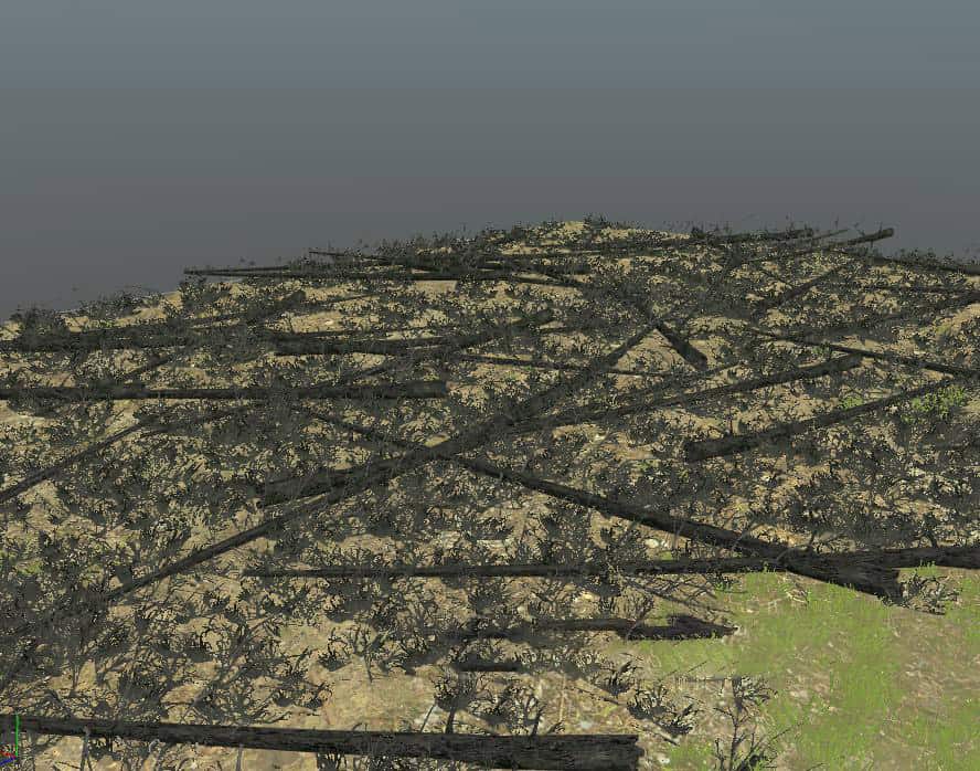 LyingSprucesFire – Sawn tops of fir trees after a fire.