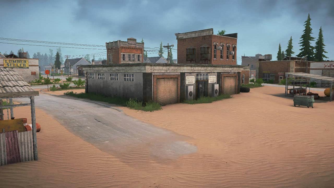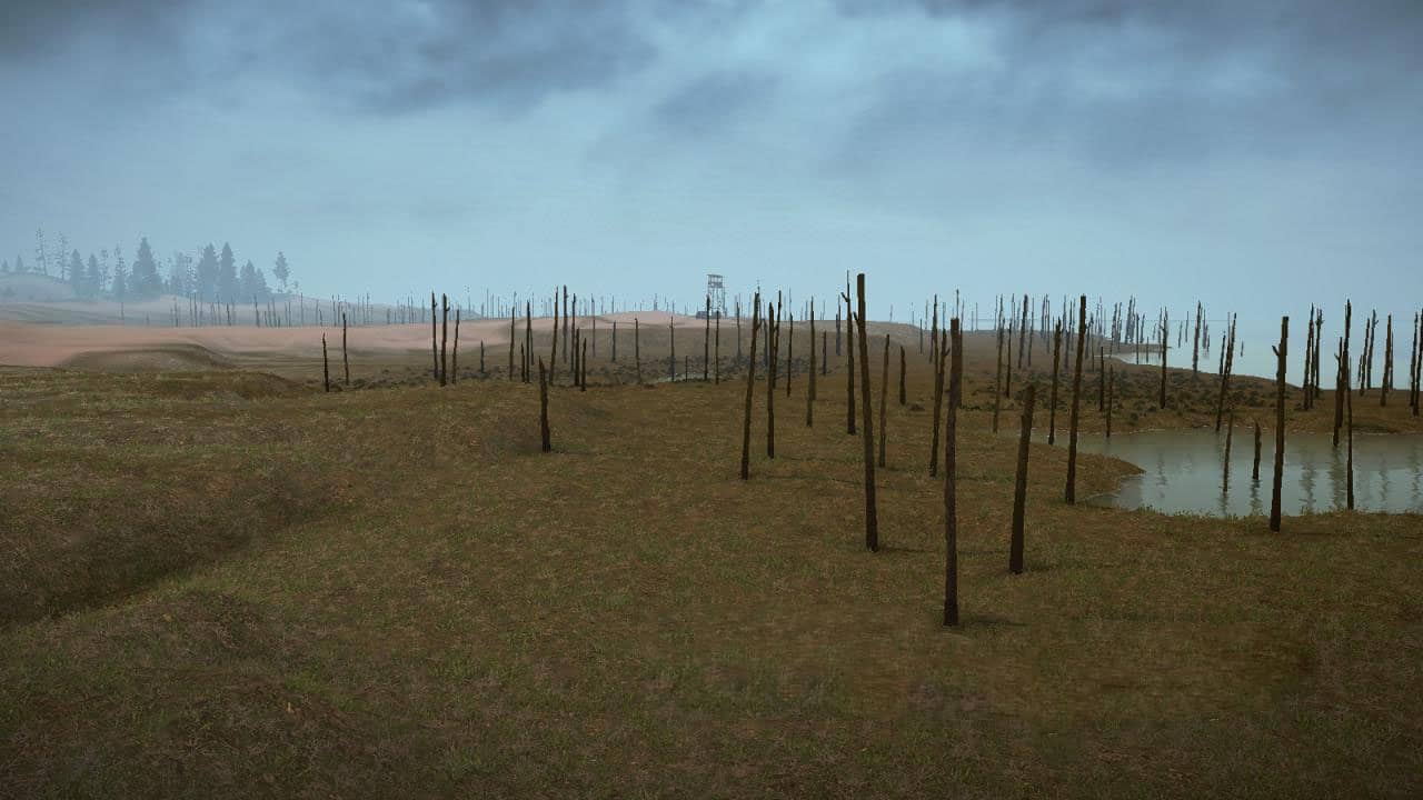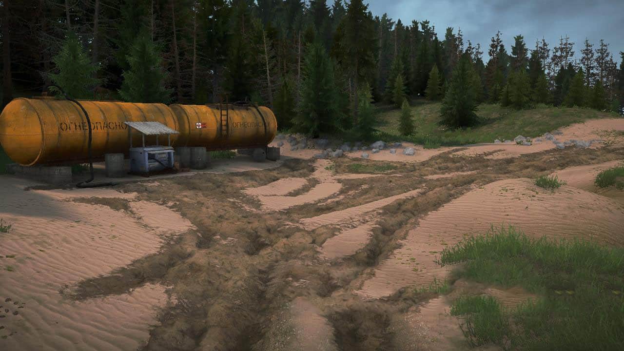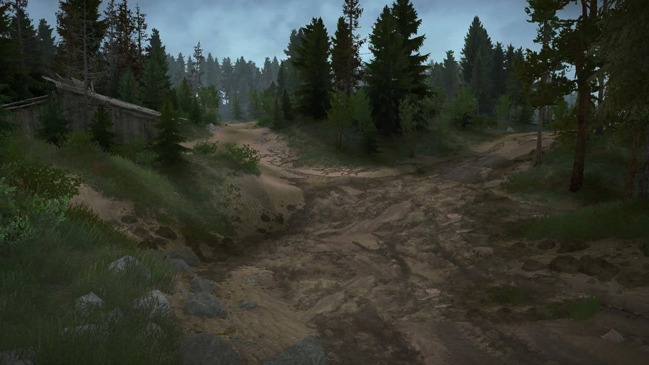 The map represents a canyon-bed of a dried-up river, the banks of which have preserved a forested area. The landscape is predominantly cascading. The task is to deliver the forest to the city and its outskirts. The map is presented in two versions with open and closed garages.