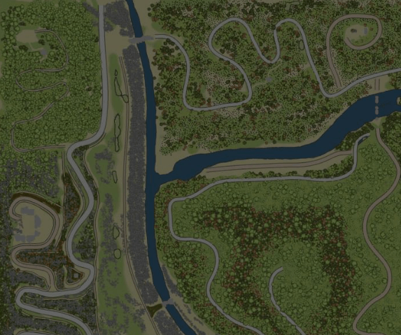 The map is medium in size (672 mx 672 m). The average complexity. Four small hills, separated by two rivers. You will have to cross them with bridges.