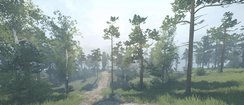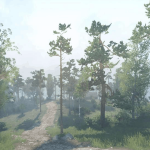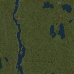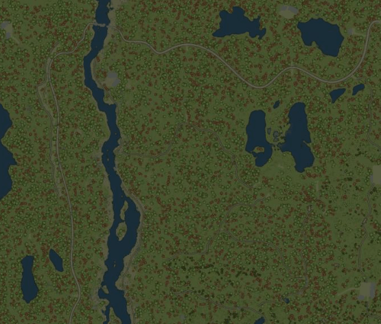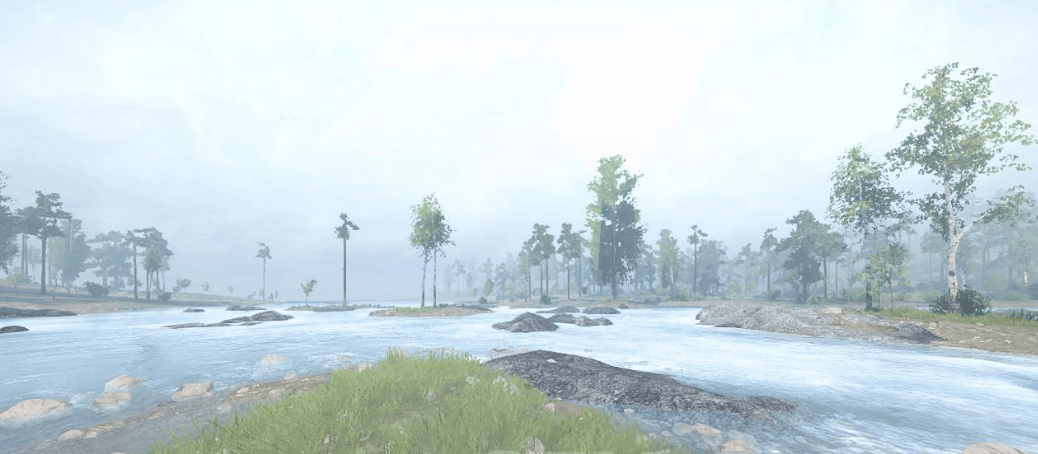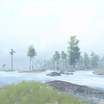 A large fast river cuts through this dirty mixed forest landscape.