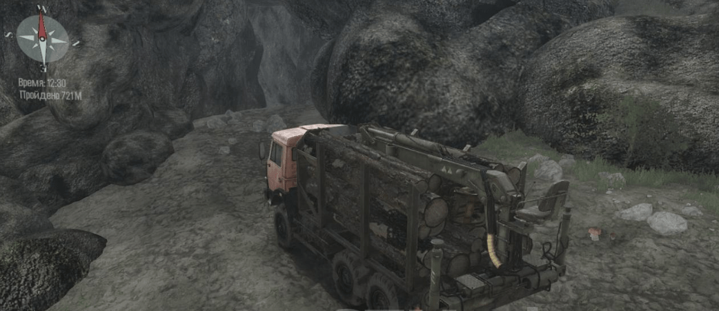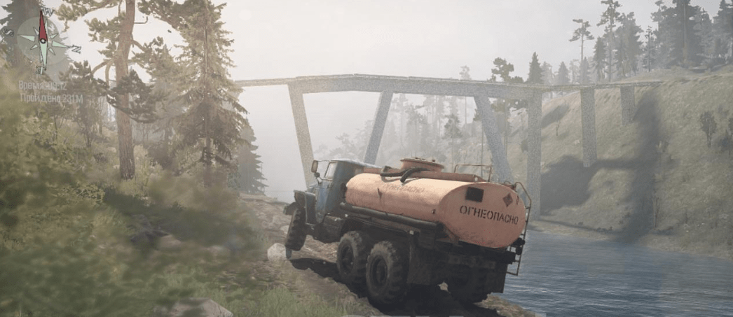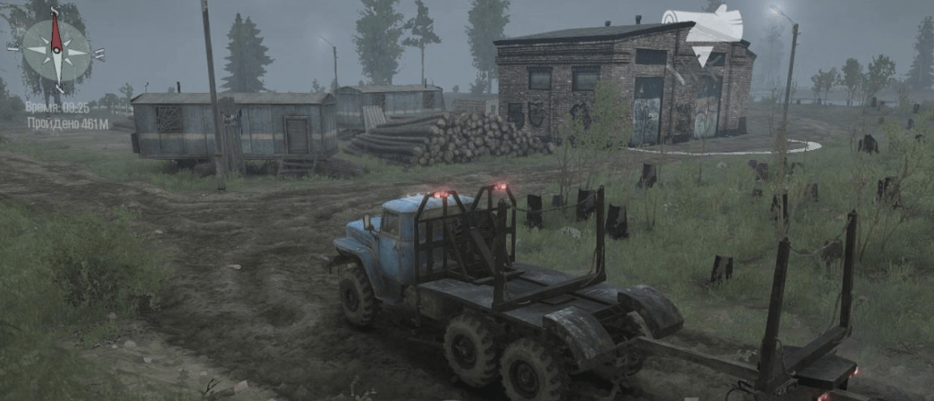 The map is moderately dirty, for the all-wheel drive default, as before, there are ascents, descents, and a water-wheel. There are alternative ways to all sawmills, you can choose how to drive. There are caves on the map, passing through them you need to make an appearance from the cabin.