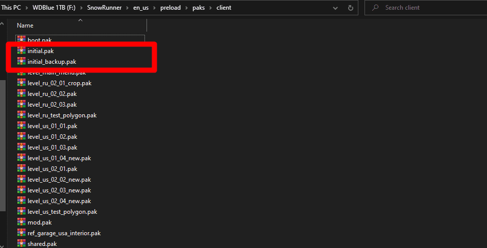 Drag-&-Drop the folders inside the initial.pak provided into a backup of your own (by making a backup of the default one in the SnowRunner directory like in the image below; SnowRunner > en_us > preload > paks > client)