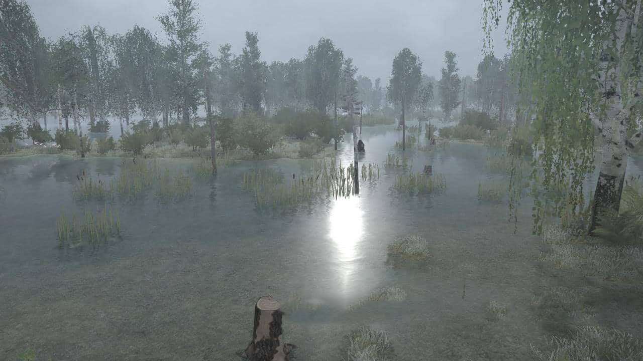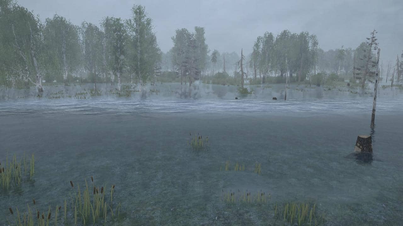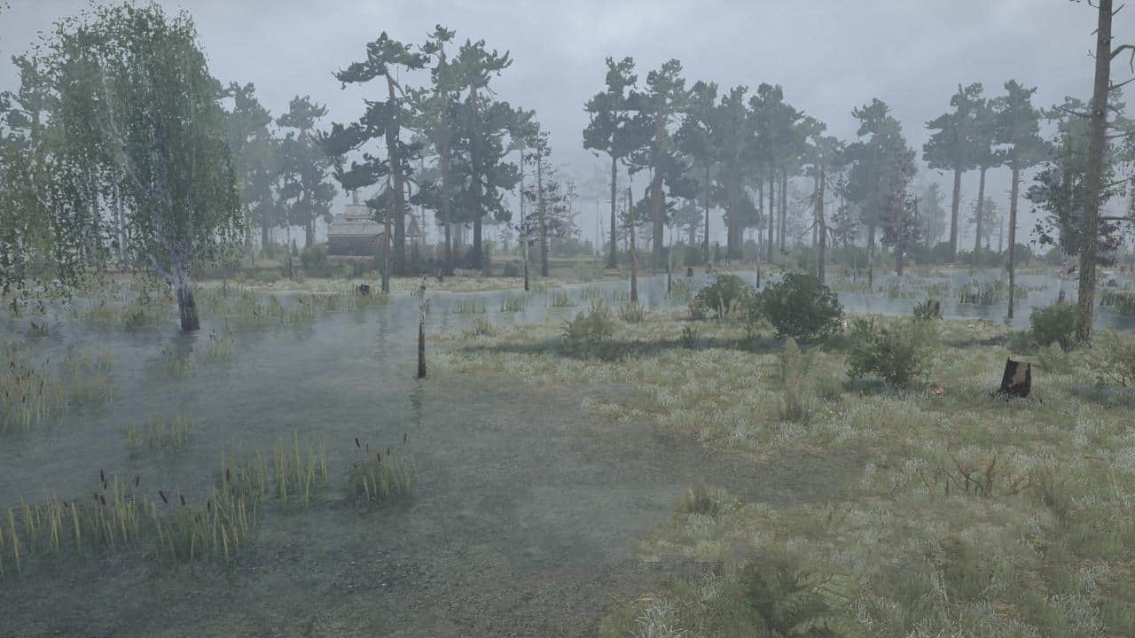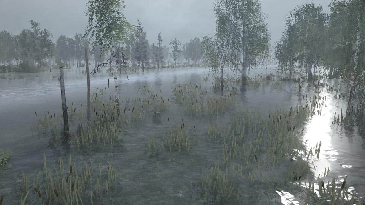 This is a swamp map with a lot of dirt on it. Mud-free areas are below the center of mass of the land and in deep water (so you can get out if you get into it). There are no roads, so you make your own way around the map. The trees are thin so you can walk in any direction.