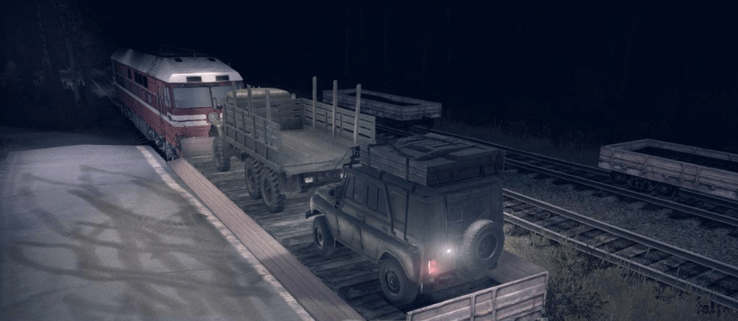 The spawn points of the logs are behind the barrier, and (according to the plot) you can take them only by train (if you don’t read) – immediately to one of the power-saw benches, or to the nearest station, and overload there (note that logs on platforms are not packed – use a platform with a board for their transportation). Drive the train carefully! And then they can get off the rail or get stuck (the game is still about cars, not steam locomotives).