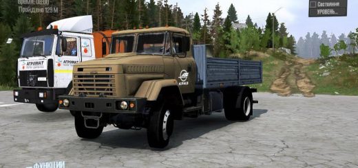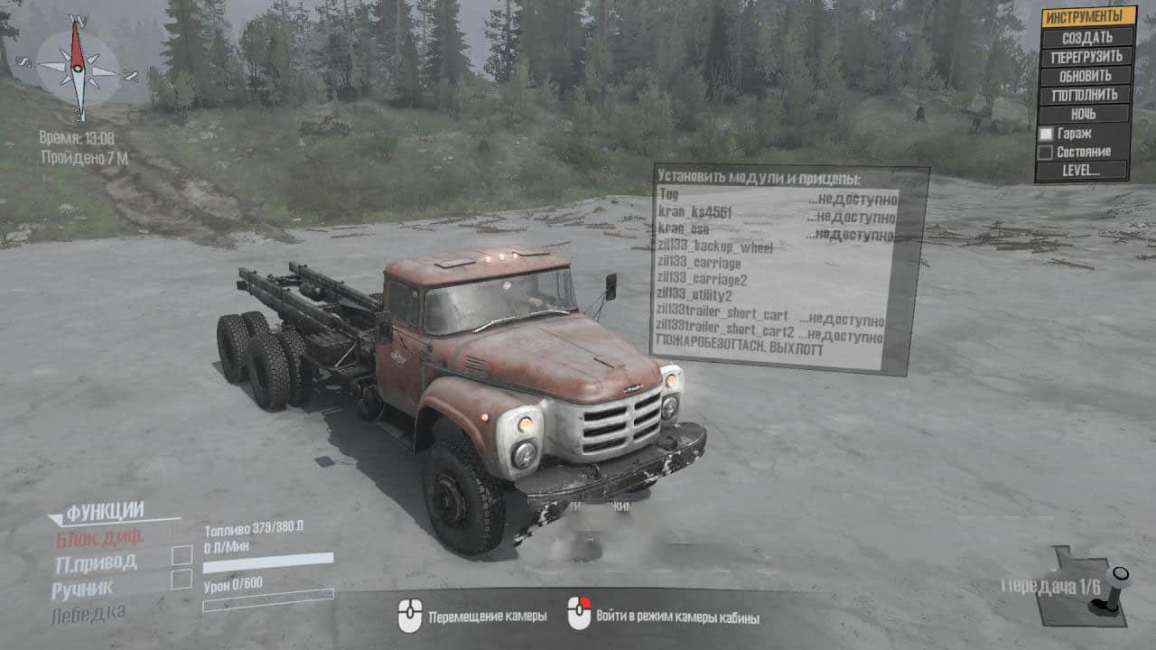 It rotates normally, it is even possible to hook something and pull it out of the swamp. The crane carries a garage (4 points), a small amount of belts and fuel. All with a tap. Other addons carry 3 and 6 points of cargo. The device behind the cab also has a strap. I repainted the car and add-ons for a change, but for those who do not like it, I saved it and its native textures in the archive, you will easily find.